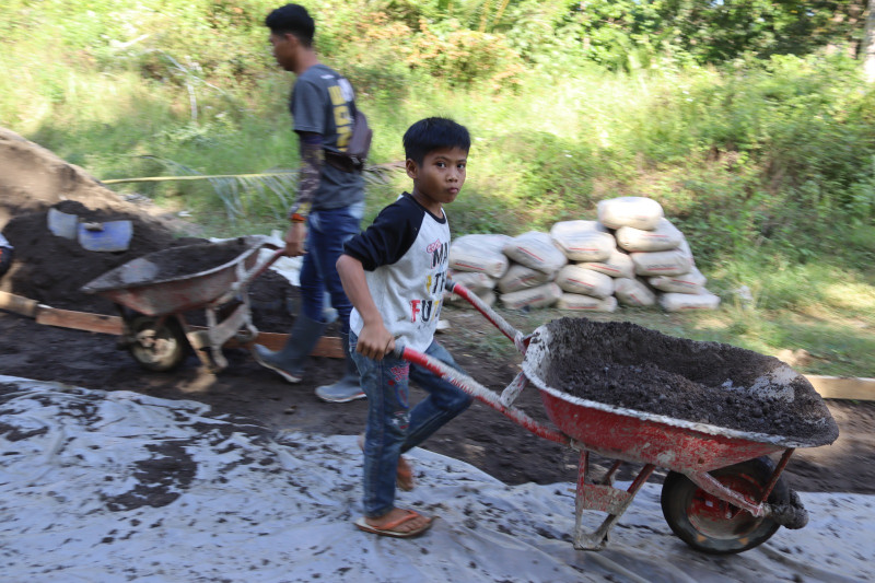 Anak Kecil tak Ketinggalan ikut Membantu Satgas TMMD Ke-121 Kodim 0612/Tsm dalam Pengecoran jalan di desa Pangliaran kec.Pancatengan kab. Tasikmaya