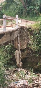 Cianjur.Mitrapolisitv.com – Akibat Putusnya Besi coran sebagai penyanggah jembatan mengakibatkan sebagian badan jembatan mengalami kerobohan.