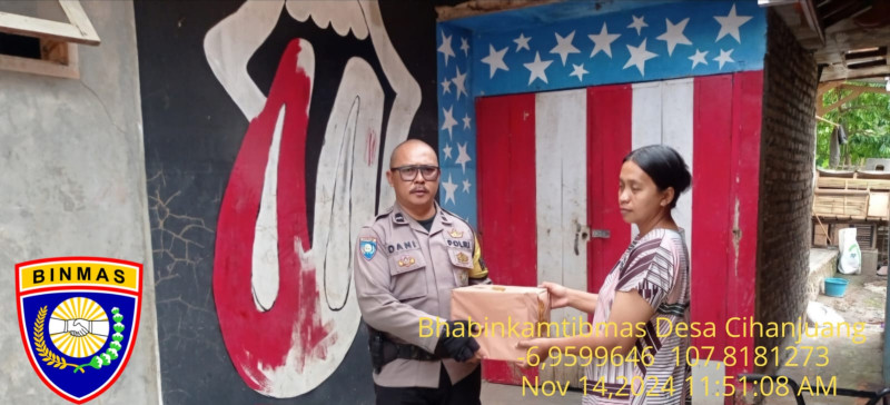 Cimanggung_Sumedang. Bhabinkamtibmas Desa Cihanjuang Polsek Cimanggung Polres Sumedang Polda Jabar AIPDA DANI RAMDANI HIDAYAT telah melaksanakan kegiatan silaturahmi kamtibmas sekaligus memberi sarana kontak berupa Sembako Kepada Warga Dusun Bunter Rt 02/02 Desa Cihanjuang Kecamatan Cimanggung Kabupaten Sumedang. Kamis (14/11/2024).