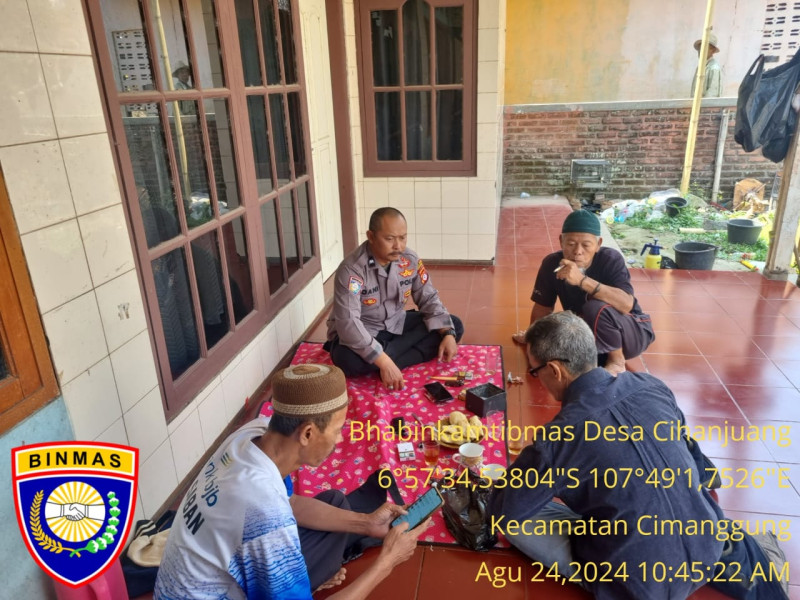 Cimanggung_Sumedang. Bhabinkamtibmas Desa Cihanjuang Polsek Cimanggung Polres Sumedang Polda Jabar AIPDA DANI RAMDANI HIDAYAT telah melaksanakan kegiatan sambang kamtibmas dan pelayanan Dumas keliling dalam rangka pelaksanaan BEYOND TRUST PRESISI Polri ke warga masyarakat Desa Cihanjuang di Dusun Cijaringao Rw.07 Desa Cihanjuang Kecamatan Cimanggung Kabupaten Sumedang tentang pencegahan money politic jelang pilkada 2024. Sabtu (24/08/2024).