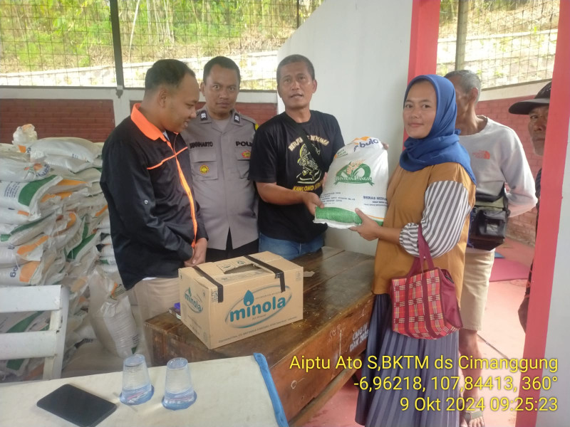 Cimanggung_Sumedang. Bhabinkamtibmas Desa Cimanggung polsek Cimanggung Polres Sumedang Polda Jabar AIPTU ATO SUGIHARTO telah melaksanakan monitoring kegiatan Pendistribusian Beras Bantuan Pangan Cadangan Beras Pemerintah (CBP) yang dilaksanakan di Gor GBC Dsn Cibembem rw 12 Desa Cimanggung Kecamatan Cimanggung Kabupaten Sumedang, kepada Keluarga Penerima Manfaat. Rabu (09/10/2024).