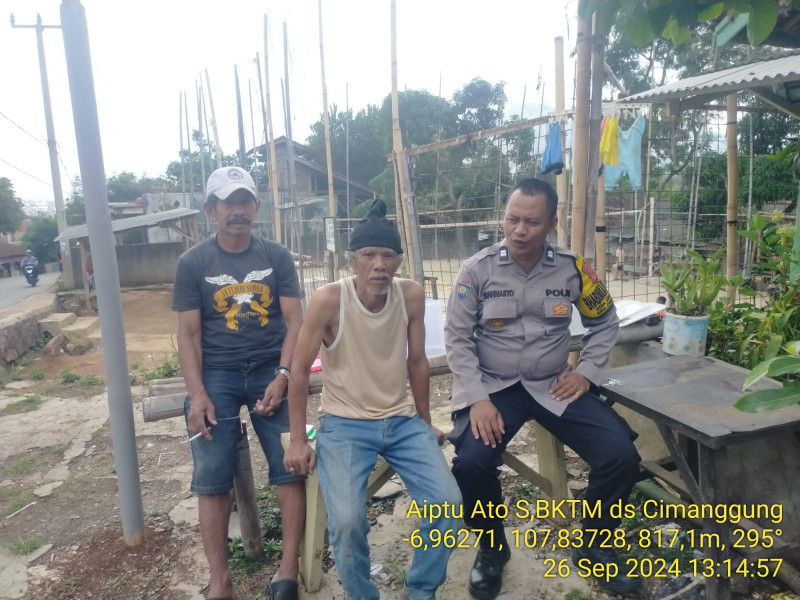 Cimanggung_Sumedang. Bhabinkamtibmas Desa Cimanggung Polsek Cimanggung Polres Sumedang Polda Jabar AIPTU ATO SUGIHARTO telah melaksanakan kegiatan sambang kamtibmas dan pelayanan Dumas keliling dalam rangka pelaksanaan BEYOND TRUST PRESISI Polri ke warga masyarakat Desa Cimanggung Kecamatan Cimanggung Kabupaten Sumedang tentang pencegahan money politic jelang pilkada 2024. Kamis (26/09/2024).