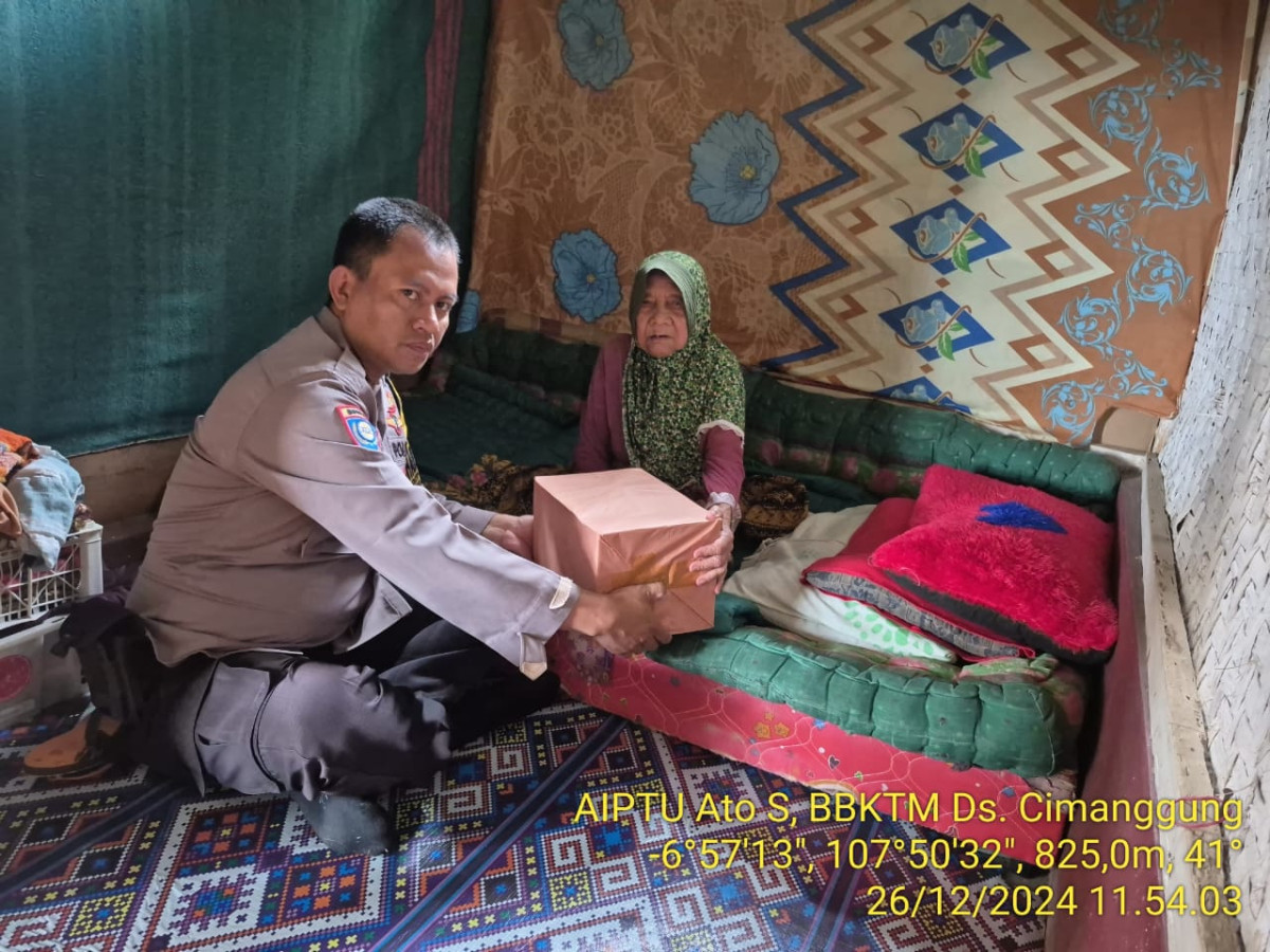 Cimanggung_Sumedang. Bhabinkamtibmas Desa Cimanggung Polsek Cimanggung Polres Sumedang Polda Jabar AIPTU ATO SUGIHARTO telah melaksanakan kegiatan silaturahmi kamtibmas sekaligus memberikan sarana kontak berupa Sembako Kepada Warga Ma Omin 90 th Dusun legok Bitung Rt 02/13 Desa Cimanggung Kecamatan Cimanggung Kabupaten Sumedang. Kamis (26/12/2024).