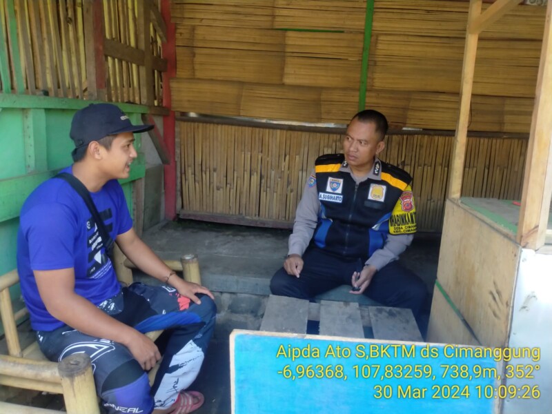 Cimanggung_Sumedang. Dalam rangka mempererat tali silaturahmi antara warga masyarakat binaan dengan bhabinkamtibmas Desa Cimanggung Polsek Cimanggung Polres Sumedang Polda Jabar AIPDA ATO SUGIARTO melaksanakan giat sambang ke warga Desa Cimanggung Kecamatan Cimanggung Kabupaten Sumedang. Sabtu (30/03/2024).