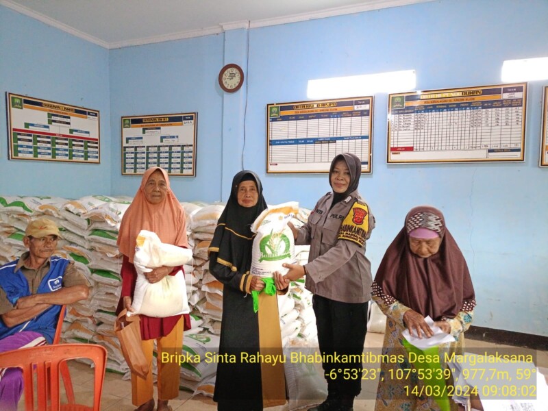 Sumedang-Pada hari Kamis, tanggal 14 Maret 2024, Bhabinkamtibmas Desa Margalaksana Polsek Sumedang Selatan Polres Sumedang, Bripka Sinta Rahayu, melakukan kegiatan monitoring Pendistribusian bantuan pangan – cadangan pemerintah Beras Bulog melalui PT.POS Indonesia.