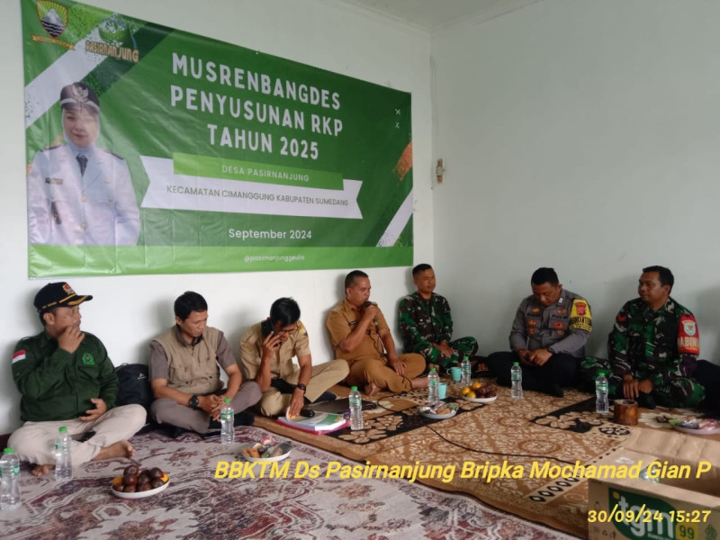 Cimanggung_Sumedang. Bhabinkamtibmas Desa Pasirnanjung Bripka Mochamad Gian Pratama melaksanakan monitoring kegiatan Musrenbang (Musyawarah Perencanaan Pembangunan)Desa Pasirnanjung bertempat di Kantor Desa Pasirnanjung Kecamatan Cimanggung Kabupaten Sumedang. Senin (30/09/2024).