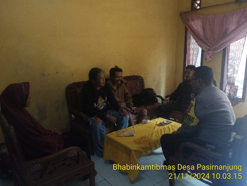 Cimanggung_Sumedang. Bhabinkamtibmas Desa Pasirnanjung Polsek Cimanggung Polres Sumedang Polda Jabar BRIPKA MOCHAMAD GIAN PRATAMA telah melaksanakan kegiatan sambang dan silaturahmi kamtibmas kepada bapak Rw 08 Desa Pasirnanjung Kecamatan Cimanggung Kabupaten Sumedang. Dalam rangka pelaksanaan BEYOND TRUST PRESISI tentang pencegahan money politic jelang pilkada 2024. Kamis (21/11/2024).