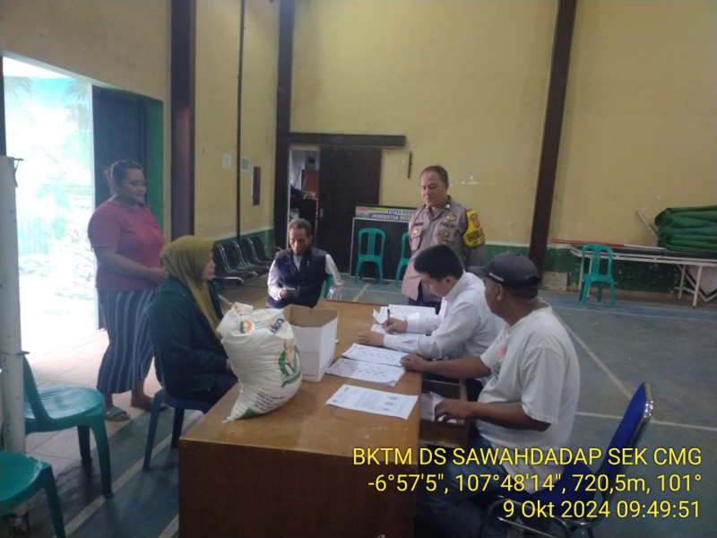 Cimanggung_Sumedang. Bertempat di Aula Desa Sawahdadap Kecamatan Cimanggung Kabupaten Sumedang, Bhabinkamtibmas Polsek Cimanggung Polres Sumedang Polda Jabar AIPTU DENI ROHMANA monitoring kegiatan pelaksanaan penyaluran Bantuan Pangan beras Alokasi Bulan Oktober Tahun 2024 untuk KPM Ds.Sawahdadap Kecamatan Cimanggung dengan jumlah penerima sebanyak 619 KPM. Rabu (09/10/2024).