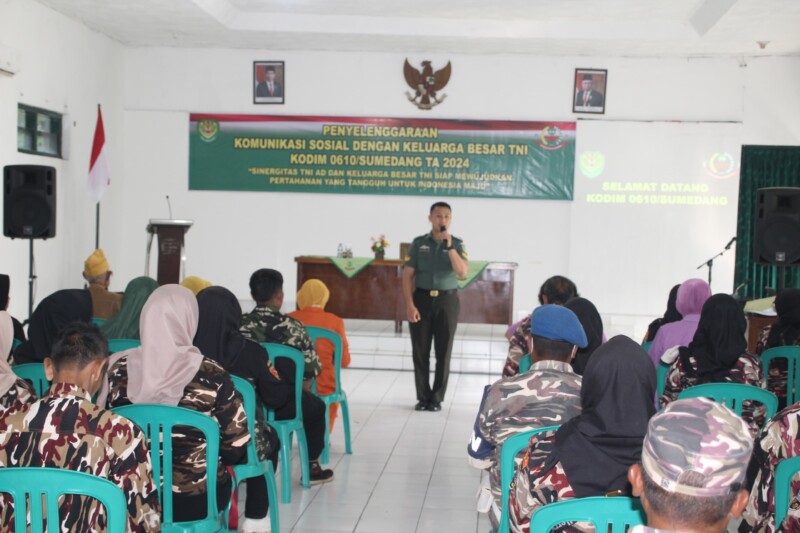 Sumedang– Kodim 0610/Sumedang menggelar kegiatan Komunikasi Sosial (Komsos) dengan Keluarga Besar TNI (KBT) guna mempererat hubungan Sosial dan jaring teritorial wilayah kodim 0610/Sumedang ,kegiatan diselengarakan di Aula Juang Apet Makodim 0610/Smd jl Pangeran Kornel 164 Kelurahan Pasanggrahan Baru, Kecamatan Sumedang Selatan Kabupaten Sumedang. Selasa(11/06/2024)