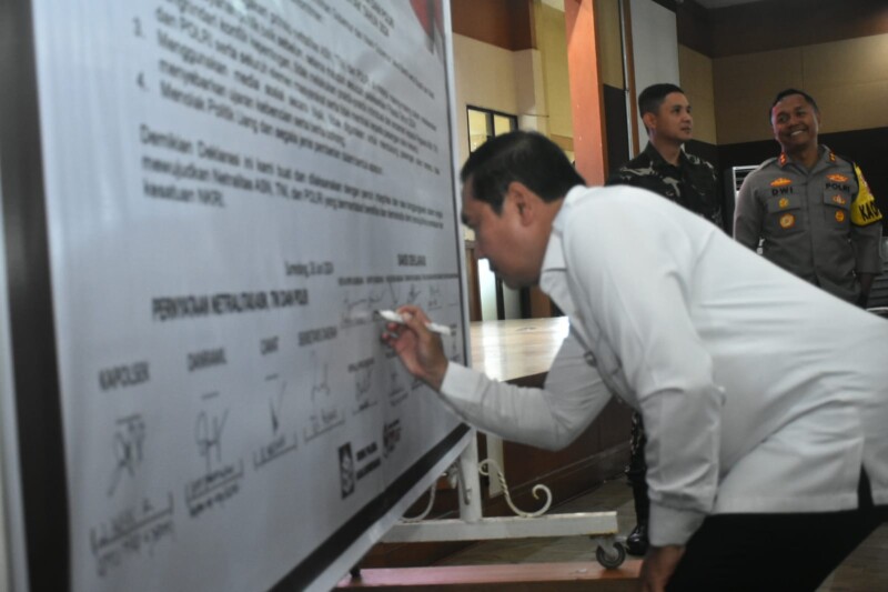 Mitrapolisitv.com Deklarasi Netralitas ASN, TNI dan Polri pada Pilkada Serentak 2024 digelar Forkopimda, Komisi Pemilihan Umum (KPU) dan Badan Pengawas Pemilu (Bawaslu) Kabupaten Sumedang di Aula Tampomas PPS, Rabu (26/06/2024).