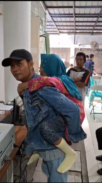 Karena melihat keadaan posisi ma Iyot sedang sakit, Adien langsung menjemput ke rumah nya dan mengendong ma Iyot yang menginjak usianya 71 tahun warga kp. Barukaso RT.03 RW 03 Desa Sukamulya Kecamatan Cugenang Kabupaten Cianjur.
