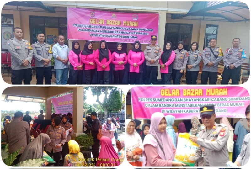 Sumedang – Dalam upaya menstabilkan harga beras di wilayah Kabupaten Sumedang, Polres Sumedang bersama Bhayangkari Cabang Sumedang menggelar bazar murah yang bertempat di Mako Polsek Conggeang, Jalan Raya Conggeang No. 277, Desa Conggeang Kulon, Kecamatan Conggeang, Kabupaten Sumedang, 45391. Kegiatan ini menarik perhatian warga dan berhasil menjadi salah satu upaya efektif dalam menjaga stabilitas harga pangan di tengah masyarakat.Sabtu (16/04/2024)
