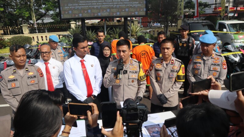 “Ada dua orang tersangka yang berhasil diamankan yaitu inisial DF usia 36 tahun yang merupakan warga Kabupaten Cianjur dan ZM 31 tahun yang berperan sebagai debitur yang merupakan warga warga Kabupaten Cianjur. Adapun barang bukti yang berhasil diamankan diantaranya 18 unit sepeda motor matic Yamaha Mio Gear, 13 unit sepeda motor matic Yamaha Aerox, 1 unit sepeda motor matic Mio M3. Semua unit sepeda motor tersebut dalam kondisi baru, selain itu ada 3 unit mobil jenis pick up berbagai merk, surat jalan dan surat keterangan hasil cek fisik.” Ucap Kapolres Cianjur saat memimpin Konferensi pers di Mapolres Cianjur, Senin (22/07/2024).
