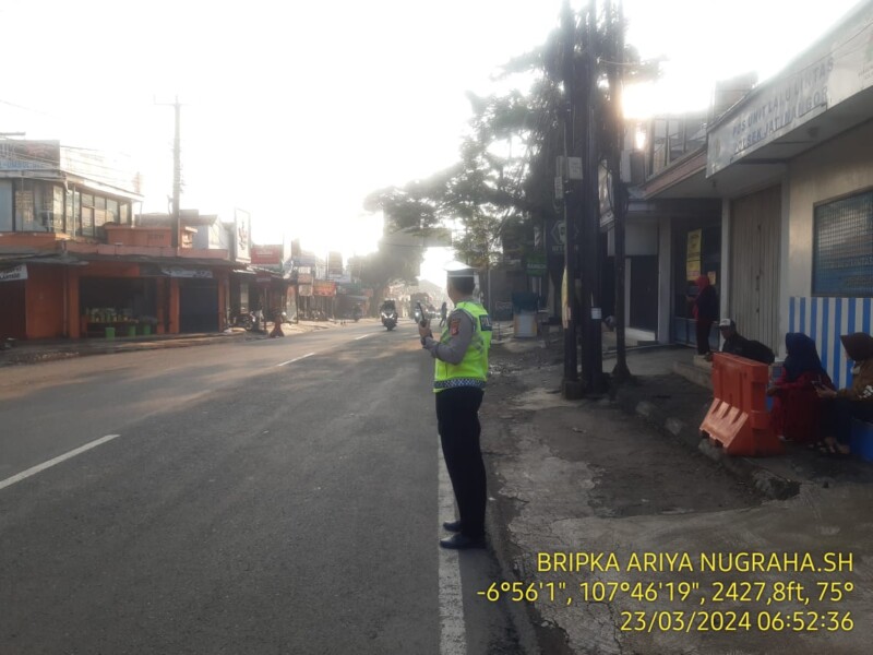 IPDA Erigal (Panit I Sat Lantas Polsek Jatinangor Polres Sumedang) di dampingi AIPTU Sugondo (Panit II Sat Lantas Polsek Jatinangor) bersama BRIPKA Arya Nugraha,.S.H, bersama BRIGADIR Vicky lakukan Pengaturan Lalu Lintas Pagi di Jalan Raya Ir Soekarno wilayah Kecamatan Jatinangor Kabupaten Sumedang.