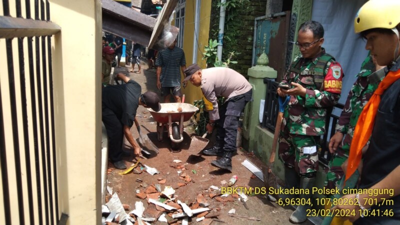 Cimanggung_mitrapolisitv.com Sumedang. Bertempat di Dsn Bojong bolang Rt 02/01 Desa Sukadana Kecamatan Cimanggung Kabupaten Sumedang. Bhabinkamtibmas Desa Sukadana Polsek Cimanggung Polres Sumedang BRIPKA TRI WIDODO dan Babinsa Sertu Ahmad Nursalam telah melaksanakan kegiatan kerja bakti membersihkan, mengangkut matrial yg hancur akibat terjadinya angin puting beliung yang terjadi pada hari Selasa tanggal 21 Pebruari 2024 yang beberapa rumah warga mengalami kerusakan. Jum’at (23/02/2024).