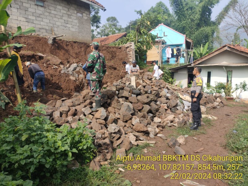 Cimanggung mitrapolisitv.com Sumedang. Bhabinkamtibmas Desa Cikahuripan Polsek Cimnggung Polres Sumedang Polda Jabar AIPTU AHMAD SUBEKTI bersama Babinsa Serka Dedi Firmansyah melaksanakan kegiatan Pengecekan TPT rumah warga yang longsor akibat hujan deras milik sadar Usup dsn Cibenda RT 01/04 desa Cikahuripan Kecamatan Cimnggung Kabupaten Sumedang. Kamis (22/02/2024).