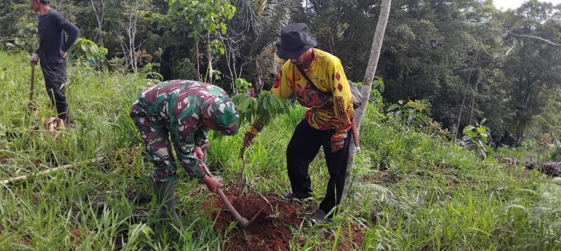 Sumedang-Anggota Koramil 1015/Cibugeul Kodim 0610/Sumedang melaksanakan penanaman pohon ,yang bertempat di blok tanah carik desa Tamansari Kecamatan Cibugel kabupaten Sumedang, Selasa(23/04/2024)