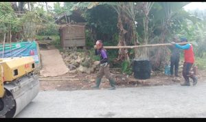 Pemdes caringin laksanakan kegiatan peningkatan dan pemeliharan jalan lIngkungan desa dengan pengaspalan ( lapen Shandseet ) di kampung gadog Rt 005 Rw 007 desa caringin kecamatan cisolok kabupaten sukabumi minggu tanggal 13 /07/ 2025