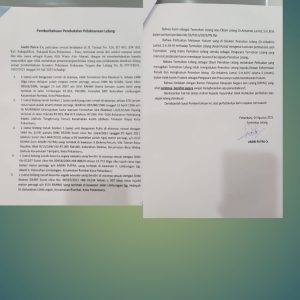 Pihaknya juga mengajukan pemberitahuan pembatalan pelaksanaan lelang satu bidang tanah beserta segala sesuatu yang berdiri di atasnya sesuai dengan SHM No 01267 Surat Ukur No 00458/2005 NIB 00829 seluas 30.713 (tiga ribu tujuh ratus tiga belas) meter persegi, a/n ANDRI PUTRA, yang terletak di kawasan Jalan Limbungan Gg. Abadi Il, Kelurahan Limbungan, Kecamatan Rumbai, Kota Pekanbaru….ini lahan nya tidak ada dan tidak ada letak sita juga oleh PN Pku