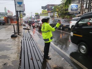 Lengkap dengan menggunakan jas hujan, Polisi cantik melakukan pengaturan arus lalulintas di simpang jalan, tempat-tempat yang rawan kemacetan, rawan lakalantas, pusat keramaian serta di depan Sekolah, Pada Selasa, 19 Agustus 2025.