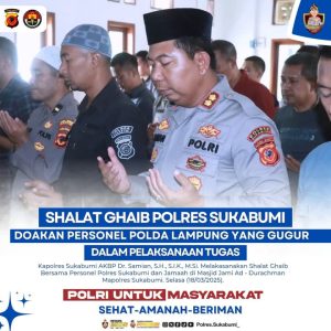 “Kami bersama seluruh personel Polres Sukabumi melaksanakan Shalat Ghaib sebagai bentuk solidaritas dan doa untuk para anggota Polda Lampung yang gugur dalam tugas. Semoga almarhum mendapatkan tempat terbaik di sisi Allah SWT dan keluarga yang ditinggalkan diberikan ketabahan,” ujar AKBP Samian.